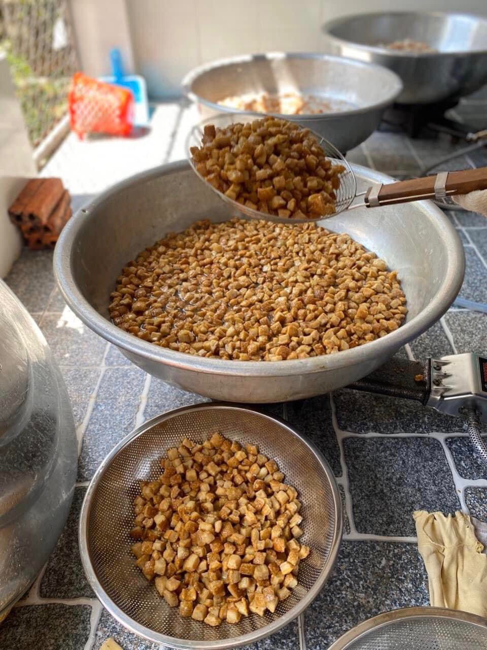 Miếng tóp mỡ ngon còn da dính vào để "trung hòa" độ béo, lại tăng độ giòn rụm. Tóp mỡ khi chiên xong để ráo thì bắt đầu được thêm đường, nước mắm tỏi ớt.